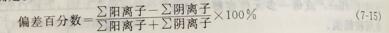 二、電中性 設計前,水分析必須用電中性法校核—即以CaCOs表示的陽離子必須等于陰離子精確平衡偏差由下式確定。 若偏差大于士10%,則在水分析中有嚴重錯誤或遺漏。為更準確地設計,應獲得更完全的水分析。 如果偏差小于士10%,則若陽離子低增加Na*,陰離子低增加SO來早衡。表7-38 給出了水分析中的各種離子由 mg/兒離子變為mg/L CaCO。的換算系數, 由mg/L離子變為mg/L CaCO需乘以系數,由 mg/LCaCO變為mg/L離子需除以系數。